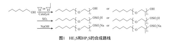 根據文獻[11]報道的方法,在高壓反應釜中加入正己醇和烷氧基化催化劑,升溫后通入環氧乙烷或環氧丙烷,分別合成正己醇聚氧乙烯醚(HE3)與正己醇聚氧丙烯醚(HP3)。隨后用經發煙硫酸制備的三氧化硫,與HE3或HP3進行硫酸化反應后再用氫氧化鈉中和,最后經除鹽和萃取提純得到淺黃色膏狀HE3S和HP3S,合成路線如圖1所示。