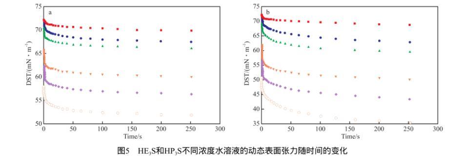 圖5 HE3S和HP3S不同濃度水溶液的動(dòng)態(tài)表面張力隨時(shí)間的變化