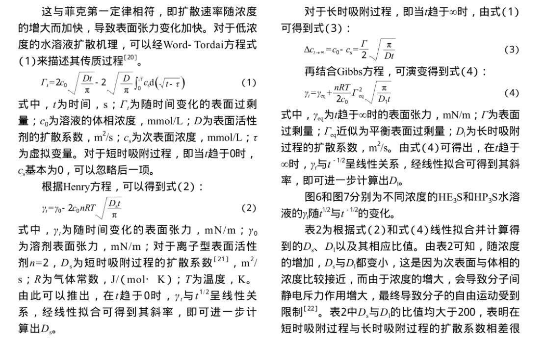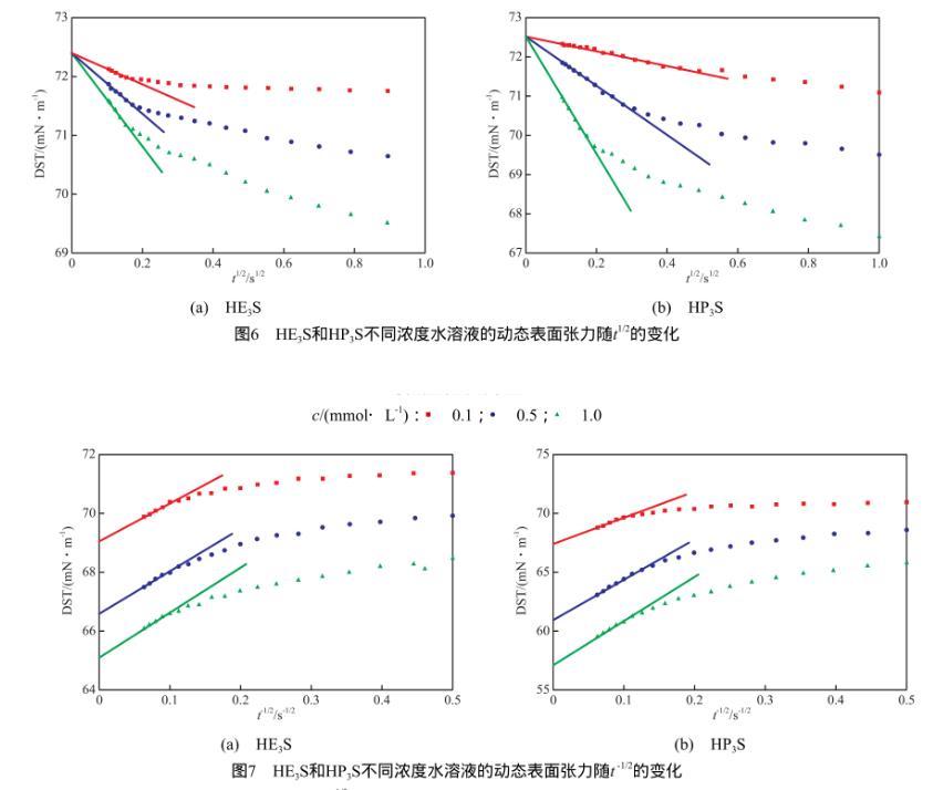 2)水溶液中的HE3S和HP3S分子可以快速擴(kuò)散到氣-液界面,迅速降低表面張力并達(dá)到平衡值,對(duì)于低濃度水溶液,這兩種表面活性劑的吸附過(guò)程都屬于混合動(dòng)力控制吸附。