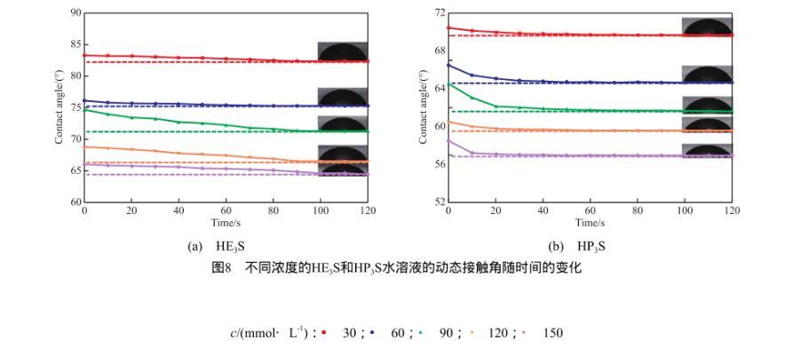 圖8不同濃度的HE3S和HP3S水溶液的動(dòng)態(tài)接觸角隨時(shí)間的變化