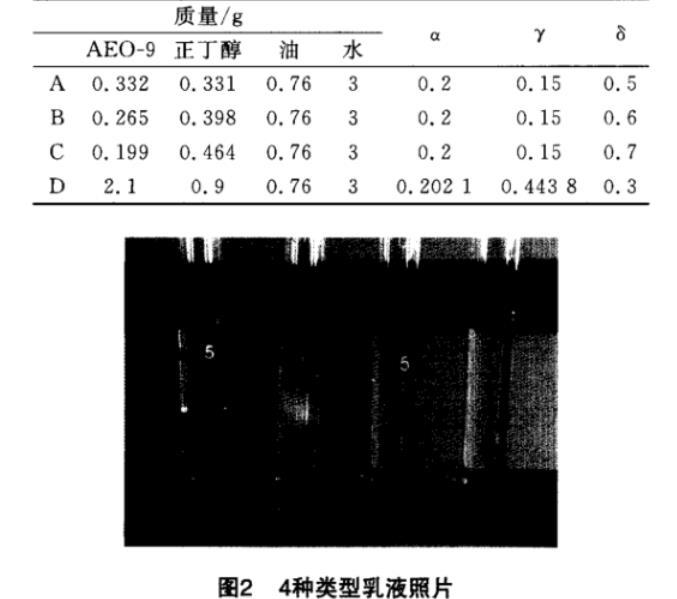 由圖1可見,在所配制的乳液中,既有均相乳液,也有兩相(上相、下相)乳液,同時有三相(中相)乳液。在選擇典型體系時,應(yīng)體現(xiàn)出全面性,即以上4種類型乳液都涉及到,同時應(yīng)考慮到漸變性,即固定某個變量(此處固定γ),一種相態(tài)向另一種相態(tài)轉(zhuǎn)變。由此,選出其中4組:A(下相乳液)、B(中相乳液)、C(上相乳液)、D(均相乳液),A、B、C、D的組成如表1所示,形成的乳液照片如圖2所示。分別將乳液部分分離出來,稀釋成質(zhì)量分數(shù)為0.1%、0.3%、0.5%、1.0%的微乳液。