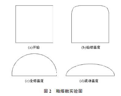 通過對釉料熔融實驗的觀察可以看到,隨著溫度升高,低共融物產(chǎn)生,試樣出現(xiàn)液相,逐漸變?yōu)槿垠w。四棱柱試樣最先變形的部位為頂部角點。由于角點是四棱柱曲率最大的部位(7/8的表面與空氣接觸),表面張力最大,表面能高,由表面張力產(chǎn)生的指向熔體內(nèi)部的附加壓力也最大,因此角點最先熔融變圓,此時試樣所處的溫度(1180℃),稱為釉的始熔溫度,釉層開始封閉,如圖2b所示。隨著溫度繼續(xù)升高,四棱柱的棱邊也開始熔融變圓,棱邊也是曲率較大的部位(3/4的表面與空氣接觸)。最后,四棱體的各個平面開始熔融變圓(1/2的表面與空氣接觸),整個試樣由于表面張力的作用變?yōu)榘肭驙睿藭r的溫度(1260℃)稱為全熔溫度,如圖2c所示,形成平整、光滑的釉面。釉層雖然處于黏性流動狀態(tài),但黏度較大不至于流淌,因此接近于釉的成熟溫度。溫度繼續(xù)升高,試樣流散開來,高度降至原有高度的1/3時的溫度(1300℃)稱為流動溫度,見圖2d。此時由于溫度升高,熔體表面張力減小,同時釉熔體黏度降低,受重力作用熔體會產(chǎn)生自然流淌,熔體表面由球面變?yōu)闄E球面。