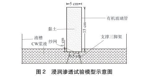 浸潤滲透試驗模型如圖2所示,主要由液槽、支撐三腳架和透明有機玻璃管組成。有機玻璃管直徑5cm,高15cm,頂端敞開,底部封閉鉆有直徑0.5cm的進漿孔。試驗時將黏土裝入有機玻璃管中,振搗壓實,底部開孔處墊有紗網,防止土體掉落。將有機玻璃管和支撐三腳架放入漿液槽內,有機玻璃管底部浸入漿液液面以下1.0cm,使漿液從底部滲入黏土中,通過觀察漿液在不同時間的滲透高度來評價漿液的浸潤滲透效果。