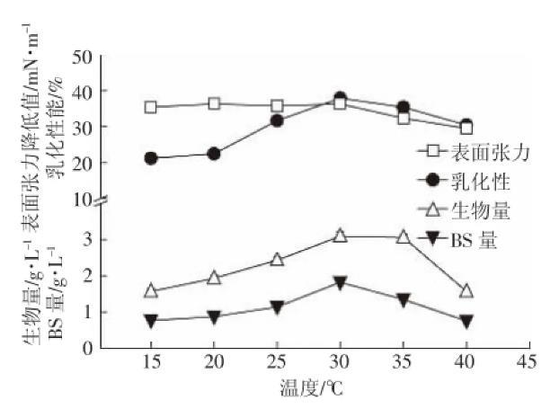 溫度是影響菌株發(fā)酵產(chǎn)物產(chǎn)量的重要環(huán)境因素之一。不同細菌的最適生長溫度不同。一般細菌在4℃停止生長,在30℃左右生長良好。已報道的銅綠假單胞菌(Pseudomonas aeruginosa)最適溫度一般在27~37℃。由圖4可以看到,表面張力值、生物量和生物表面活性劑產(chǎn)量都隨著溫度的升高呈現(xiàn)先升高后降低的趨勢,在30℃時達到最大。乳化性在15℃到30℃時保持相對穩(wěn)定,在30℃到40℃時乳化性降低。實際上大多數(shù)銅綠假單胞菌的最佳培養(yǎng)溫度都在27~37℃,與實驗結(jié)果相符。