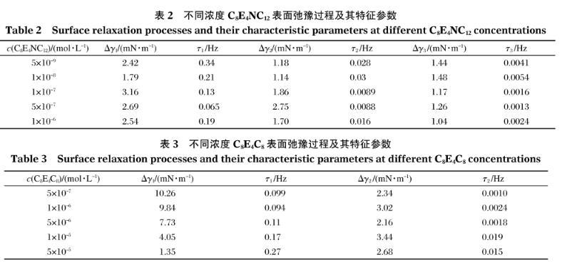 表2示出了不同濃度C8E4NC12表面弛豫過程的特征參數,Δγ1、Δγ2、Δγ3分別代表弛豫過程的貢獻,τ1、τ2、τ3分別代表弛豫過程的特征頻率。從表中可以看出,在實驗濃度范圍內,C8E4NC12分子在表面上存在三類弛豫過程:最快的弛豫過程特征頻率的數量級在0.1 Hz,可能對應于表面活性劑分子在界面和體相間的擴散交換過程;最慢的弛豫過程特征頻率在0.001 Hz數量級,可能對應于表面大量吸附分子的重排;中間弛豫過程特征頻率在0.01 Hz數量級附近變化,可能對應于分子在表面上排列方式的變化。