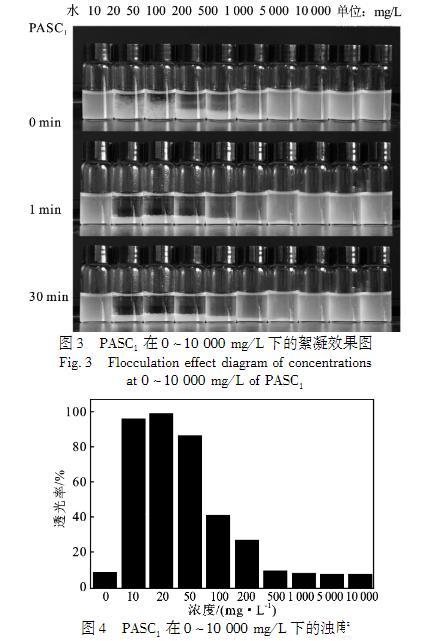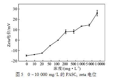 PASC1的絮凝效果見(jiàn)圖3、圖4.PASC1濃度為10——50mg/L時(shí),透過(guò)率接近100%,繼續(xù)增加PASC1的濃度,體系重新變得渾濁。隨著PASC1濃度的進(jìn)一步增加,體系的透過(guò)率降低,粘土顆粒懸浮體系重新穩(wěn)定。粘土顆粒的表面由于同構(gòu)取代而帶負(fù)電荷,這意味著需要陽(yáng)離子達(dá)到電荷平衡。對(duì)于鈉基膨潤(rùn)土(Na——BT),Na+離子被吸引到層空間中。當(dāng)Na——BT與水接觸時(shí),水可進(jìn)入晶層內(nèi)部,使可交換陽(yáng)離子解離,在晶層表面建立擴(kuò)散雙電層,從而產(chǎn)生負(fù)電性。