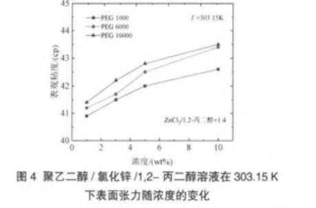 圖4聚乙二醇/氯化鋅/1,2-丙二醇溶液在303.15 K下表面張力隨濃度的變化