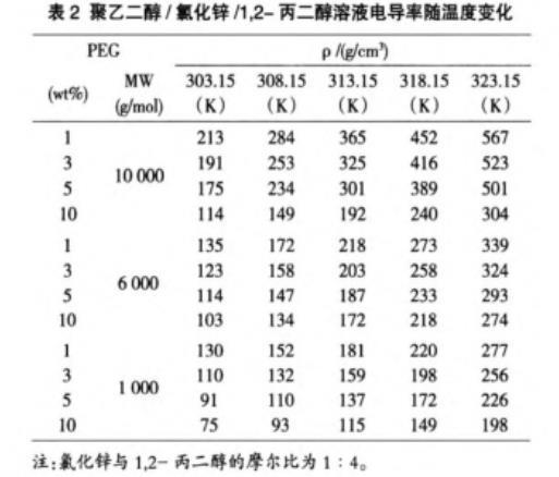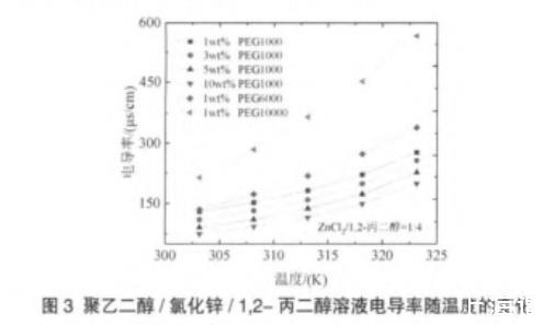 表2聚乙二醇/氯化鋅/1,2-丙二醇溶液電導率隨溫度變化