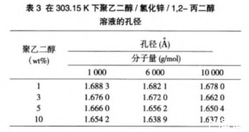 表3在303.15 K下聚乙二醇/氯化鋅/1,2-丙二醇溶液的孔徑