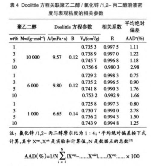 表4 Doolittle方程關聯聚乙二醇/氯化鋅/1,2-丙二醇溶液密度與表觀粘度的相關參數