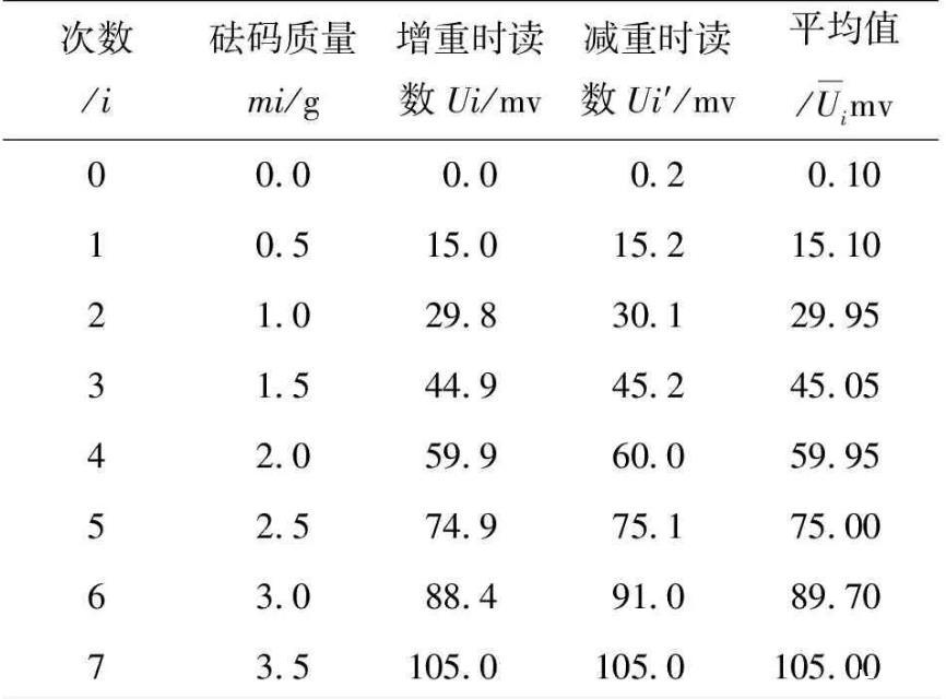 對于力敏傳感器靈敏度的測量,保持不增加實驗成本的原則,采用多次測量,先依次增加片碼個數,再依次減少片碼個數的方法平均人為誤差,然后用逐差法求得力敏傳感器的靈敏度,具體測量數據如表1所示。