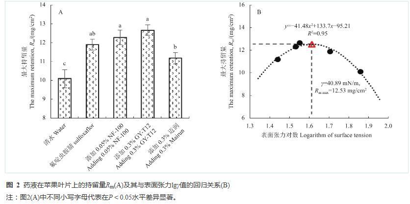 為探索藥液表面張力與藥液在蘋果葉片表面最大持留量的關系,將各處理藥液表面張力(γ)取l g值后與對應的最大持留量Rm作圖并進行了回歸分析,如圖2-B。可以看出:Rm隨著γ增大呈現出先增大后迅速降低的趨勢,二者之間存在拋物線狀函數關系,滿足二次多項式y=?41.48x2+133.7x?95.21,R2為0.95。根據曲線預測,當藥液γ為40.89 mN/m時,藥液在蘋果葉片上最大持留量Rm達最大值12.53 mg/cm2。該結果可應用于成熟“富士”蘋果園,在果實膨大后期病蟲害化學防治中,可利用助劑調控藥液的表面張力使藥液達到最大持留。