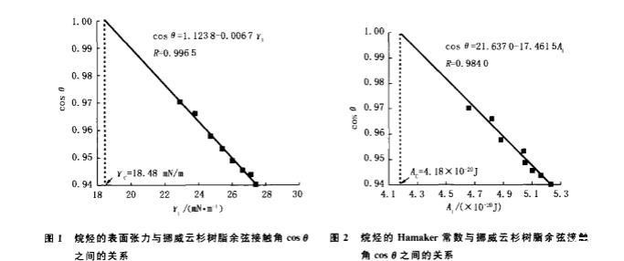 圖1烷烴的表面張力與挪威云杉樹(shù)脂余弦接觸角cos0之間的關(guān)系