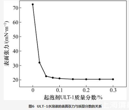 當(dāng)起泡條件相同時(shí),起泡劑水溶液的表面張力越低,發(fā)泡體積越高。配制一系列濃度梯度的起泡劑ULT-1水溶液,利用接觸角/表面張力測(cè)量?jī)x采用懸滴法測(cè)量表面張力與起泡劑ULT-1質(zhì)量分?jǐn)?shù)的關(guān)系,結(jié)果如圖6所示。從圖6可知:當(dāng)起泡劑ULT-1質(zhì)量分?jǐn)?shù)小于0.05%時(shí),表面張力隨起泡劑ULT-1質(zhì)量分?jǐn)?shù)的提高快速降低;當(dāng)起泡劑ULT-1質(zhì)量分?jǐn)?shù)大于0.05%時(shí),表面張力降幅越來(lái)越小;當(dāng)起泡劑ULT-1質(zhì)量分?jǐn)?shù)提高至0.2%時(shí),表面張力降至20.40 mN/m,較蒸餾水降低了71.82%,繼續(xù)提高起泡劑ULT-1的質(zhì)量分?jǐn)?shù),表面張力不再降低。表明新型起泡劑ULT-1在較低濃度時(shí)即達(dá)到較低的表面張力,有利于提高發(fā)泡體積。