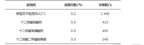 起泡性能主要是指起泡能力和泡沫穩(wěn)定性。發(fā)泡體積V0反映了起泡能力,析液半衰期t1/2反映了泡沫穩(wěn)定性。在室溫下,稱取一定質(zhì)量的起泡劑ULT-1于攪拌杯中,加入100 mL蒸餾水,置于攪拌器之上,以轉(zhuǎn)速11 000 r/min攪拌1 min。攪拌完畢后,立即取下攪拌杯,同時(shí)啟動(dòng)秒表,開始記錄消泡時(shí)間,將攪拌杯中的所有物質(zhì)全部倒入1 000 mL量筒中,讀取發(fā)泡體積和從泡沫中析出50 mL液體的時(shí)間,即為半衰期。通過(guò)改變起泡劑ULT-1的質(zhì)量測(cè)量起泡性能與起泡劑質(zhì)量分?jǐn)?shù)的關(guān)系,結(jié)果如圖7所示。從圖7可知:隨起泡劑ULT-1質(zhì)量分?jǐn)?shù)的提高,發(fā)泡體積增加幅度較大,半衰期緩慢增加。當(dāng)ULT-1質(zhì)量分?jǐn)?shù)升到0.2%時(shí),發(fā)泡體積達(dá)到501 mL,半衰期達(dá)到1 440 s,繼續(xù)提高質(zhì)量分?jǐn)?shù)發(fā)泡體積和半衰期基本不變,表明研制的新型起泡劑ULT-1低濃度時(shí)即具有較高的起泡性能,發(fā)泡體積高,泡沫半衰期長(zhǎng)。同時(shí),對(duì)比評(píng)價(jià)了常用起泡劑的半衰期,結(jié)果如表1所示。從表1可知:質(zhì)量分?jǐn)?shù)為0.2%的起泡劑ULT-1與質(zhì)量分?jǐn)?shù)為0.5%的常規(guī)起泡劑相比,泡沫半衰期可提高3倍以上。