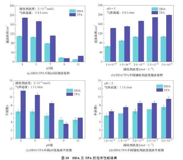 (3)在不同濃度下,TPA均得到比DDA更低的表面張力,說明TPA可能具有更多的泡沫容積,泡沫容積結果驗證了表面張力結果。在不同濃度下,TPA均得到比DDA更高的黏度,說明TPA產生的泡沫更穩定,泡沫半衰期結果驗證了黏度結果。表面張力試驗、黏度試驗、泡沫容積試驗、泡沫半衰期試驗共同證明TPA更優越的泡沫性能。將TPA應用于浮選中,能夠增大氣泡與鋰云母的碰撞及接觸概率,增強鋰云母與氣泡的黏附,減少鋰云母與氣泡的脫附,進而提高浮選回收率。