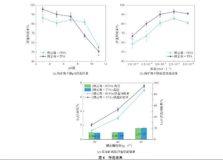實際礦浮選試驗的檢測結果如圖6(c)所示,可以看出,在較小的捕收劑用量下,TPA或DDA作用后鋰云母精礦的品位相接近。但是,較高的產率使得TPA對鋰云母的浮選回收率高于DDA。實際礦檢測結果進一步證明TPA浮選性能的優越。此外,隨著藥劑用量的加大,DDA或TPA作用鋰云母的品位與回收率均會相應提高。