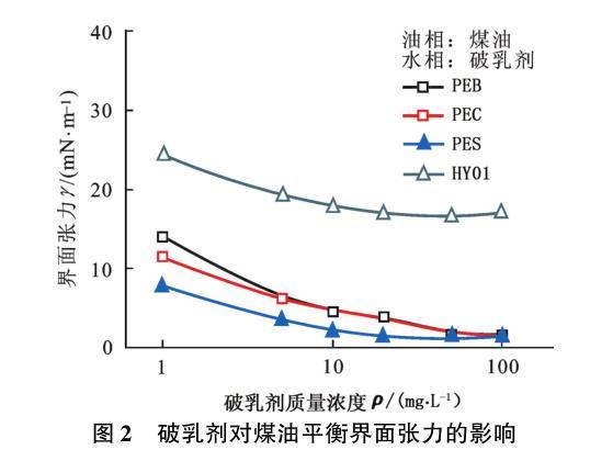 陽離子破乳劑對原油界面張力的影響呈現(xiàn)獨(dú)特的規(guī)律,但其質(zhì)量濃度低于50 mg·L-1時,界面張力始終處于一個略低于單獨(dú)1 000 mg·L-1PPG界面張力的平臺值,說明此時HY01分子主要與溶液中的PPG分子發(fā)生作用,只有少量的HY01與界面上的PPG分子發(fā)生作用;但質(zhì)量濃度達(dá)到100 mg·L-1時,HY01分子在界面上與帶負(fù)電荷的PPG分子混合吸附,造成界面張力明顯降低。在較寬的中間質(zhì)量濃度范圍內(nèi),界面張力保持不變,意味著此時界面層上HY01分子已經(jīng)飽和,這與反電荷的聚電解質(zhì)與表面活性劑相互作用的普遍結(jié)果是一致的。