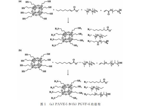 在已經加入25mL二氯甲烷溶劑的50mL圓底燒瓶中加入定量組分的APEG400、VDMS和FEMA,進行混合溶解,最后加入1%(質量分數)的光引發劑溶解完全后進行封口處理,于溫度為30℃、攪拌速度為300r/min的條件下,放置于紫外燈(20W)照射45min,反應結束后,旋蒸除去溶劑,最終得到無色透明、流動性明顯且富有粘稠狀態的液體產物POSS-APEG4001-VDMS2-FEMA5,簡稱為PAVE-5。同樣的方法改變其中之一的單體為APEG750,合成得到POSS-APEG7501-VDMS1-FEMA,簡稱PGVF-6。