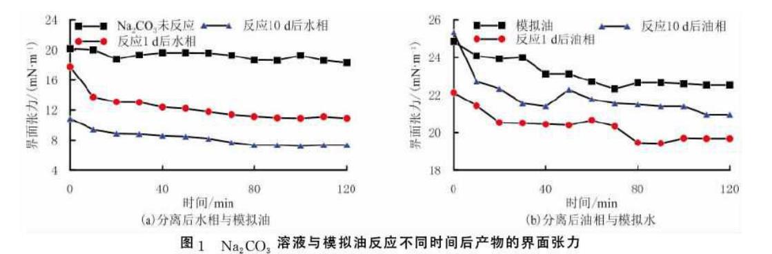 由圖1(b)可以看出,Na2CO3溶液與模擬油反應(yīng)1d和10d后分離出的油相與模擬水間界面張力低于模擬油與模擬水間的界面張力。這是由于Na2CO3溶液與模擬油反應(yīng)生成油溶性的界面活性物質(zhì)且留在油相中,隨著反應(yīng)時間的增加,反應(yīng)生成的界面活性物質(zhì)增多,使界面張力較模擬油與模擬水的界面張力降低。這說明模擬油中存在相對分子質(zhì)量較大且反應(yīng)活性低的界面活性物質(zhì),長時間與Na2CO3溶液反應(yīng)后生成油溶性較強的界面活性物質(zhì)且溶于油相中,使油水界面張力下降較多。