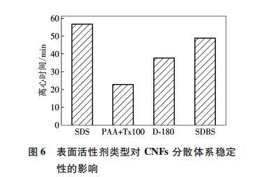 (1)UV-vis測試和Zeta電位測試結果表明,4種表面活性劑中,SDS對CNFs的分散性最好,SDBS次之,而D-180好于PAA復合Tx100.