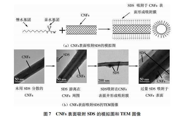 貌,而是在CNFs表面產生一種非共價鍵修飾,表面活性劑分子通過疏水端吸附在CNFs的表面,有時為平躺式吸附,通過親水端與水相互作用而鉆入水中,來實現CNFs在水性體系中的分散.離子型表面活性劑(如SDS和SDBS)主要依靠其親水性基團與憎水性基團之間的庫侖吸引力來實現吸附的作用,非離子型表面活性劑(如Tx100)主要依靠親水基團之間的靜電斥力或特殊的吸附機理吸附在CNFs的管壁上保持體系穩定,阻止CNFs的團聚.