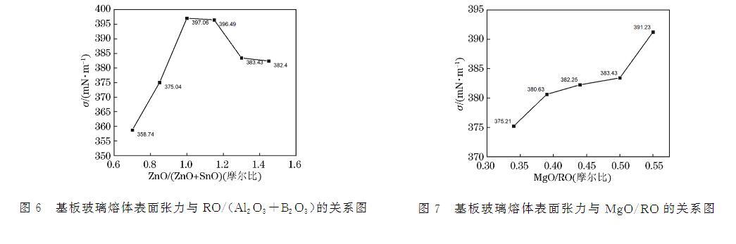 圖6 基板玻璃熔體表面張力與RO/(Al?O?+B?O?)的關(guān)系圖