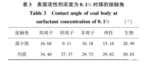 以接觸角作為判斷潤(rùn)濕的標(biāo)準(zhǔn),接觸角越小則潤(rùn)濕性能越好。表面活性劑濃度為0.1%時(shí),煤巖接觸角統(tǒng)計(jì)結(jié)果見表3。當(dāng)活性劑水溶液濃度為0.1%時(shí),陰離子表面活性劑AES水溶液與煤的接觸角最小為9.11°。進(jìn)一步將不同類型表面活性劑水溶液在濃度為0.1%時(shí)與煤的接觸角進(jìn)行均值化處理可發(fā)現(xiàn),陽(yáng)離子、陰離子、非離子、兩性及生物表面活性劑水溶液與煤的接觸角平均值分別為34.4°、27.37°、29.72°、29.82°和50.03°。因此,表面活性劑潤(rùn)濕性效果排序?yàn)椋宏庪x子表面活性劑>非離子表面活性劑>兩性表面活性劑>陽(yáng)離子表面活性劑>生物表面活性劑。