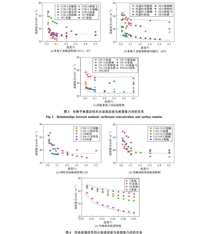 采用文獻(xiàn)調(diào)查法,匯總分析了82組不同類型表面活性劑水溶液濃度與表面張力的對(duì)應(yīng)關(guān)系[19-34],如圖1~圖4所示。