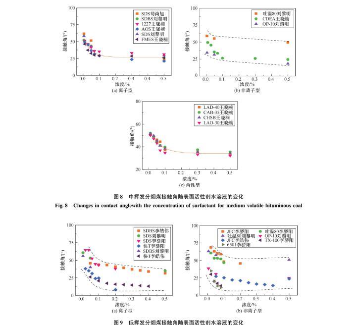 圖8中揮發(fā)分煙煤接觸角隨表面活性劑水溶液的變化