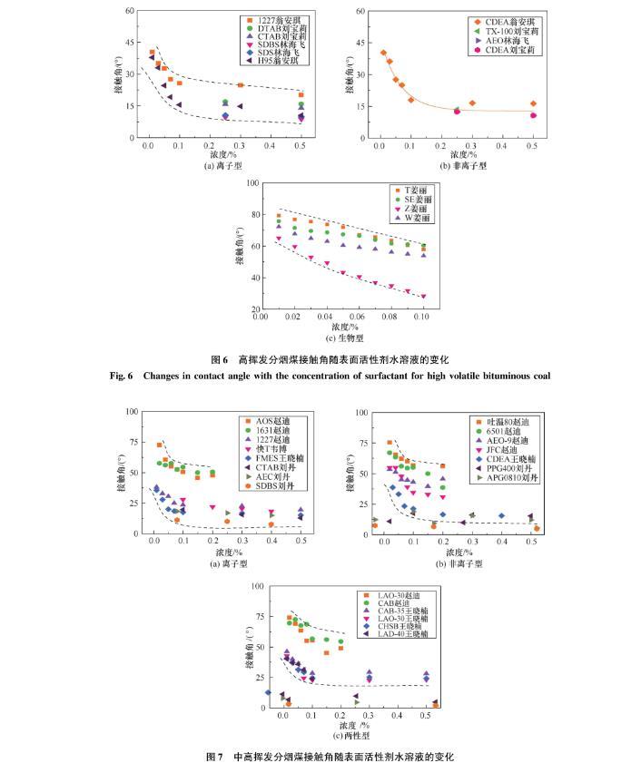 圖6高揮發(fā)分煙煤接觸角隨表面活性劑水溶液的變化