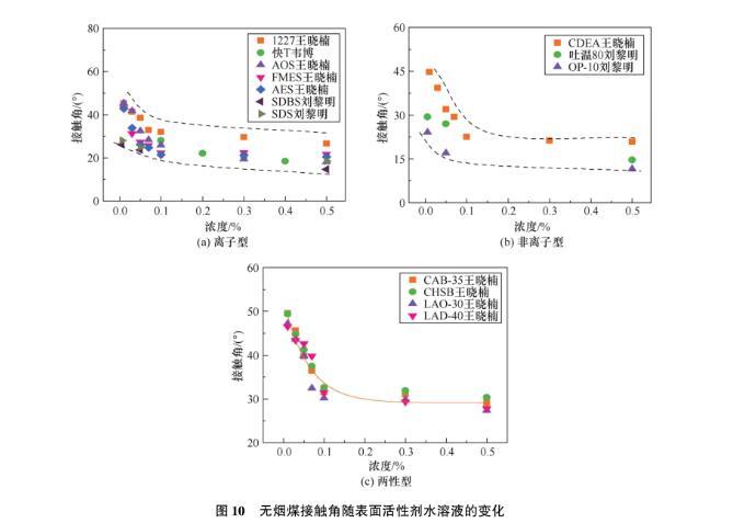 圖10無(wú)煙煤接觸角隨表面活性劑水溶液的變化
