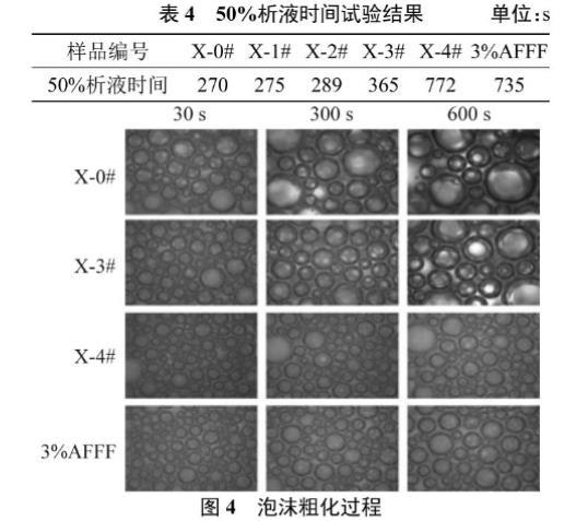 泡沫的穩定性主要由泡沫的排水、粗化和聚并等多因素決定[10]。雙注射器技術產生的6種泡沫的圖像見圖3,而6種泡沫的50%析液時間測定結果見表4。這6種泡沫在0 s時有相同的初始體積,在重力作用下發生泡沫排水現象,600 s后6種泡沫的排水體積之間存在很大的差異,X-0#、X-1#和X-2#樣品泡沫排水量幾乎達到發泡前泡沫溶液的初始體積,X-3#泡沫排水量明顯降低,X-4#泡沫的排水體積較3%AFFF的排水體積少。以上結果表明添加質量分數0.30%的XG能很好地減緩泡沫排水,使無氟泡沫和商用泡沫滅火劑有相當的泡沫穩定性。