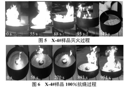 實驗所設計X-4#樣品的滅火機理主要通過泡沫層的積累,泡沫逐漸覆蓋整個油面,形成有效的覆蓋層,進一步降低了燃燒面積和火焰溫度。在滅火的過程中,泡沫覆蓋層可以有效地終止燃燒,防止再燃的發生,直至整個油面燃燒被進一步削弱和熄滅。本文中的配方主要通過在燃燒液體表面的覆蓋和冷卻,從而減少燃料蒸汽的蒸發并隔離燃燒所產生的熱輻射,從而達到有效滅火。而X-4#樣品難以快速形成水膜,延長了泡沫在汽油表面的鋪展速度,導致滅火時間長于3%AFFF。但X-4#樣品的滅火時間優于X-0#樣品,表明XG的加入提高了泡沫的熱穩定性,但其高粘度影響了泡沫在油面的鋪展速度[12],X-0#樣品的泡沫熱穩定性差,在滅火過程中大量的泡沫破裂不利于形成能有效終止燃燒的泡沫覆蓋層,導致滅火時間大于X-4#樣品。