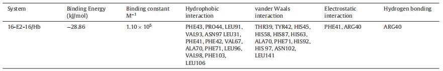 Hb 中的 α 和 β 鏈具有相似的結構折疊, 由七個連續的α-螺旋和兩條鏈組成 包含由螺旋 4 和 5 包圍的間隙結合袋,而空腔的底部由 C 端部分形成 螺旋 6 和螺旋 7 的 N 端片段 [69]。 16-E2-16為主 Hb 與中央空腔、α1 和 β2 鏈結合(圖 6A)。 這 該結合位點上的氨基酸殘基包括 Thr39, α1 中的 Tyr42、Phe43、Pro44、His45、His58、His87、Leu91、Val93、Asn97 鏈和 Leu31、Arg40、Phe41、Phe42、His63、Val67、Ala70、Phe71、 His92, Leu96, His 97, Val98, Asn102, Phe103, Leu106, Leu141 in β2 鏈圖 6B。 有超過 20 個氨基酸殘基位于 16-E2-16 的站點,這意味著它們之間的強相互作用 16-E2-16 和 Hb [70]。 疏水性和靜電力作用 在 16-E2-16 與 Hb 的結合中起重要作用,這個結果是 與我們的實驗結果一致。 然而,范德瓦爾斯 力量不容忽視。 已觀察到一個氫鍵 在 16-E2-16/Hb 相互作用中的 16-E2-O 原子 具有 β2 鏈 ARG40 的 16 個分子(圖 6C)。 的形成 氫鍵穩定 16-E2-16/Hb 復合物。 的類型 相互作用和參與相互作用的氨基酸殘基 以表格形式顯示(表 3)。