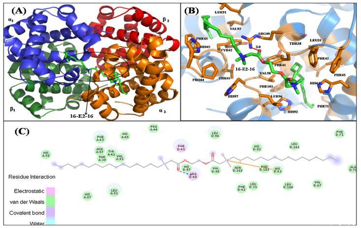 圖 6. 具有 16-E2-16 的 Hb 結構示意圖。 (A) Hb-16-E2-16 的結構。 Hb 的亞單位用不同的顏色表示。 配體 16-E2-16 是 以棍子為代表。 (B) 距??康?16-E2-16(綠色)5? 范圍內 Hb 的周圍氨基酸殘基(橙色)。 (C) Hb/16-E2-16 相互作用的二維表示。 (為了 對圖例中顏色參考的解釋,讀者可參考本文的網絡版本。)