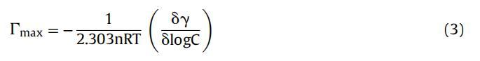 最大表面過量 (∫max) 表示為每單位面積界面處的表面活性劑分子濃度。 表面張力數據用于計算表面過量 應用吉布斯吸附等溫線的濃度 (∫max) 方程: