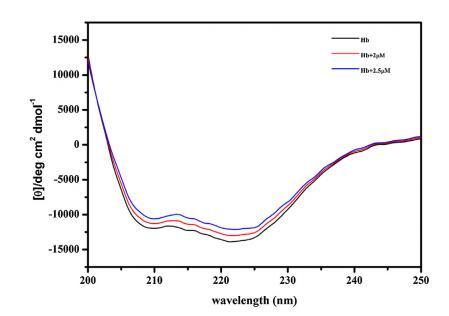 進行CD以進一步確認構象變化 由 16-E2-16 引起的 Hb,從而允許進一步評估 Hb 和 16-E2-16 之間的相互作用。 圖 5 顯示了 不存在和存在 16-E2-16 時 Hb 的 CD 光譜。 光盤 Hb 的光譜在 208 nm 和 222 nm 處顯示兩個負最小值, 蛋白質α-螺旋結構的特征。 16-E2-16 光學不活動不顯示任何信號。 在場 在 16-E2-16 中,Hb 的負橢圓度降低,表明 可能形成 Hb/16-E2-16 復合物 [68]。 α-螺旋 計算了 Hb 及其與 16-E2-16 (2 μM) 復合物的百分比,發現分別為 53% 和 47%。 進一步降低 在更高濃度的 16-E2-16 (2.5 μM) 存在下達到 44% 表明 Hb 的 α-螺旋含量明顯降低。 因此, CD 結果表明存在 16-E2-16 變化 Hb 的二級結構與我們的 計算結果。