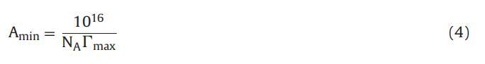 其中 γ 是表面活性劑濃度 C 下的平衡表面張力 (mNm?1),n 是每分子的粒子數 表面活性劑。 由于表面活性劑的解離導致三種物質的形成,公式 1111 表示在低于 cmc 的恒定溫度下 γ 與 log[16-E2-16] 之間的曲線斜率。 ∫max 值允許計算 每個分子 Amin 的最小表面積(以 nm2 為單位) 方程: