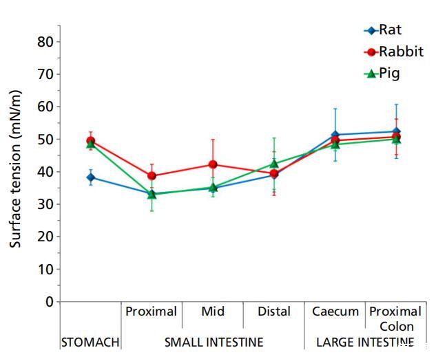 大鼠、兔和豬的胃腸液在整個腸道的表面張力明顯低于水的表面張力。這些動物的表面張力遵循一般模式,胃的表面張力較高,小腸的表面張力較低,而遠端腸道的表面張力再次升高(圖3,表1)。這種表面張力的行為也與腸道內的消化過程相一致。小腸環境中的消化營養物(如葡萄糖、氨基酸、脂肪酸)和消化分泌物(如膽汁)降低了該區域液體的表面張力,然后在遠端腸道中重新吸收,從而產生更高的表面張力。
