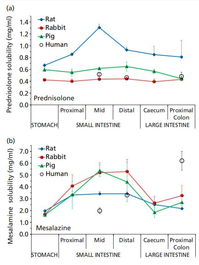 圖4(a)潑尼松龍和(b)美沙拉秦在大鼠(8只大鼠)、兔子(n=6)和豬(n=3)胃腸液(上清液)中的溶解度,Fadda等人的人類數據。[11]