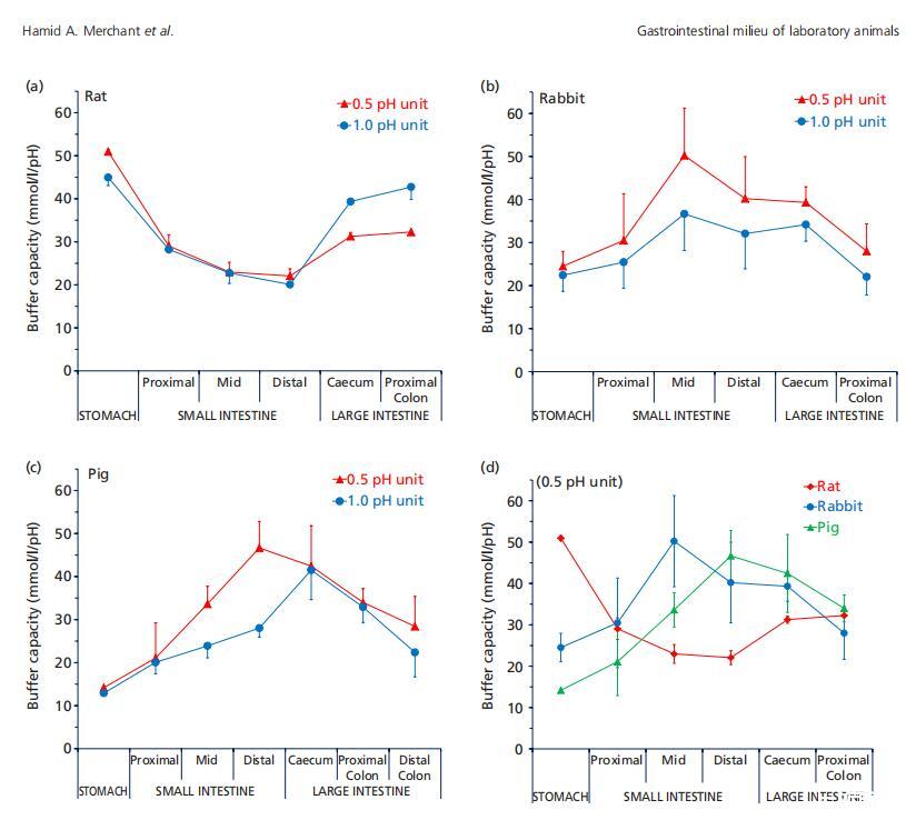 圖1(a)來自大鼠(n=3),(b)兔子(n=6),(c)豬(n=3)的混合樣品的胃腸液(上清液)緩沖容量(平均值±標準偏差(SD)),在pH單位變化0.5和1.0時測量,以及(d)整個胃腸道緩沖容量的種間趨勢。