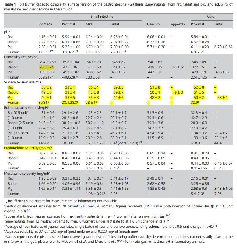 表1大鼠、兔和豬胃腸液(上清液)的pH緩沖容量、滲透壓、表面張力以及美沙拉秦和潑尼松龍在這些液體中的溶解度。