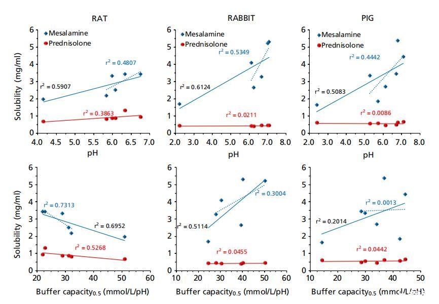 潑尼松龍的水溶性為0.223mg/ml;[11] 該值低于這些調查中觀察到的值(表1)。潑尼松龍的溶解度是合理恒定的,與豬和兔腸道樣本的位置無關,并且更接近于之前測量的人類空腸、回腸和結腸液體中的溶解度[11](圖4)。然而,從胃到小腸中部,潑尼松龍在大鼠體內的溶解度呈上升趨勢,此后,在遠端小腸中的溶解度下降,但在腸道下方沒有明顯變化。強的松在大鼠腸道液體中的溶解度通常高于人類,但在近端結腸除外,因為近端結腸的變異性更高,所以差異沒有達到統計學意義。與大鼠胃液相比,大鼠近端腸道的特殊溶解行為可能是由于近端和中段小腸的表面張力相對較低(表1)。由于潑尼松龍是一種可結合的化合物,其溶解度預計與pH無關;這與我們的研究結果是一致的。在任何受試動物物種中,潑尼松龍溶解度與緩沖容量、滲透壓或表面張力之間也沒有顯著關系(圖5)。