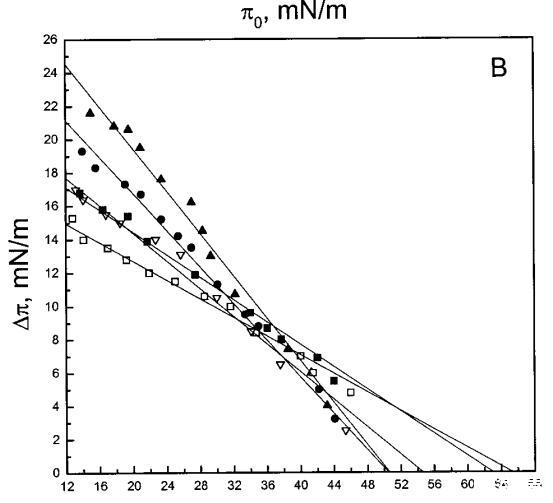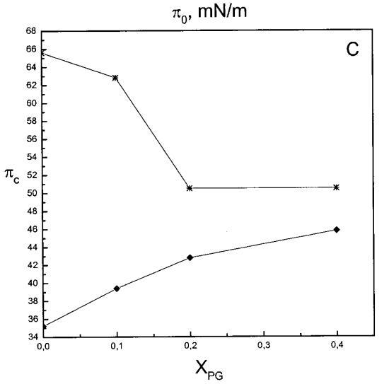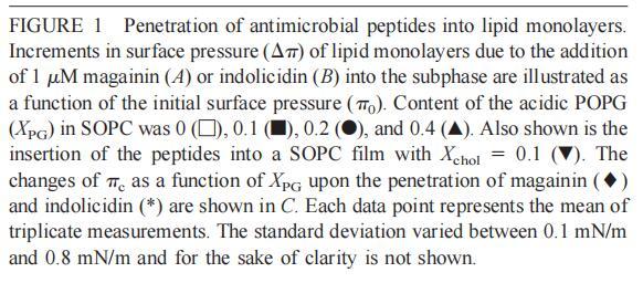 通過(guò)測(cè)量表面壓力的增量,觀察到抗菌肽在不同初始表面壓力(π0)下嵌入到空氣/水界面上的脂質(zhì)單層中(?π)將肽添加到亞相后(Brockman,1999;Verger和Pattus,1976)。Magainin 2在π0>12 mN/m時(shí)容易插入SOPC單層(圖1A),而在π0以上≈35 mN/m時(shí),其在膜中的滲透被消除,因此該值表示該肽與SOPC膜相互作用的臨界包裝壓力πc。根據(jù)其凈正電荷4(Matsuzaki,1998),當(dāng)膜中酸性磷脂POPG的含量增加時(shí),magainin 2向脂質(zhì)單層的滲透逐漸增強(qiáng)(圖1 A)。因此,消除magainin 2插入單層的πc值增加至~39(XPG=0.1)、43(XPG=0.2)和46 mN/m(XPG=0.4)(圖1c)。相反,在SOPC膜中加入膽固醇(Xchol=0.1)對(duì)magainin 2的滲透沒(méi)有顯著影響(圖1A)。