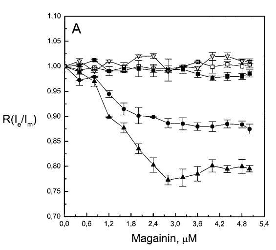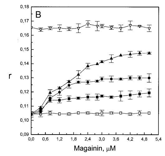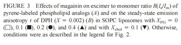 有趣的是,在存在酸性磷脂的情況下,肌動(dòng)蛋白/脂質(zhì)的摩爾比(在該摩爾比下,肌動(dòng)蛋白的初始增量趨于穩(wěn)定)分別為1:21、1:16和1:12.5,對(duì)應(yīng)于XPG=0.1、0.2和0.4(圖2A),分別產(chǎn)生1:2、1:3和1:5的肌動(dòng)蛋白/磷脂化學(xué)計(jì)量比。同時(shí),DPH的初始r增量在magainin/脂質(zhì)摩爾比為~1:30、1:12和1:5時(shí)趨于平穩(wěn)(XPG分別為0.1、0.2和0.4),對(duì)應(yīng)于大約1:3、1:2.5和1:2的magainin/PG化學(xué)計(jì)量比(圖3)。據(jù)報(bào)道,在這些肽/脂質(zhì)摩爾比下,magainin可插入含酸性磷脂的膜中(Ludtke等人,1994年)。此外,已經(jīng)證明,雙分子層中magainin的=-螺旋的方向取決于肽與脂質(zhì)的摩爾比,在上述化學(xué)計(jì)量比下,螺旋應(yīng)垂直于膜表面插入,在含PG的膜中形成孔(Ludtke等人,1996)。這些孔不僅由兩親螺旋的極性面組成,而且還由脂質(zhì)的極性頭基組成,內(nèi)外單層通過(guò)這些孔襯脂質(zhì)是連續(xù)的。膜中的這種結(jié)構(gòu)可能會(huì)降低探針芘部分微環(huán)境的極性,從而提高其量子產(chǎn)率。有趣的是,當(dāng)XPG>0.1時(shí),magainin 2逐漸降低Ie/Im值(圖3 A),這與增強(qiáng)的酰基鏈順序減少脂質(zhì)側(cè)向擴(kuò)散的速率一致。然而,由于magainin 2已經(jīng)在XPG=0.1時(shí)增加了r,Ie/Im沒(méi)有變化,我們可以得出結(jié)論,PPDPG探針向微區(qū)富集以及其橫向擴(kuò)散的減少正在發(fā)生。