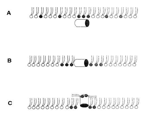對(duì)于測(cè)試的所有單層組成,吲哚青霉素的πc值超過(guò)了馬蓋寧2的測(cè)量值(圖1 c),表明該肽在酰基鏈之間有效插入和插層。吲哚西丁在~38 mN/m的交叉點(diǎn)值得關(guān)注。在后一個(gè)表面壓力之下,表面壓力的增量??在PG存在的情況下,吲哚西丁引起的反應(yīng)增強(qiáng),而在較高的初始脂質(zhì)堆積密度下觀察到相反的反應(yīng)。有趣的是,不管脂質(zhì)成分(即PG的存在)如何,交叉點(diǎn)幾乎保持不變,因此表明它可以完全由表面壓力決定,而不管靜電相互作用如何。一種可能的機(jī)制是,在π0>38 mN/m時(shí),吲哚西丁以壓力依賴的方式改變其在單層中的取向,可能是從其長(zhǎng)軸相對(duì)于層平面的平行到垂直取向(圖9,B和C),從而減少面積/肽并減少?π.此外,一些靜電結(jié)合吲哚肽的PG分子也可能與單層中的磷脂方向不同。換句話說(shuō),吲哚西丁與其相關(guān)的PG將形成一種超分子復(fù)合物,其取向?qū)⑷Q于壓力。這在圖9中示意性地示出。重要的是,所提出的肽連接磷脂的重新定向?qū)⑴c最近提出的模型兼容,在該模型中,穿過(guò)雙層的孔表面的一部分將由脂質(zhì)頭基構(gòu)成(Ludtke et al.,1996)。