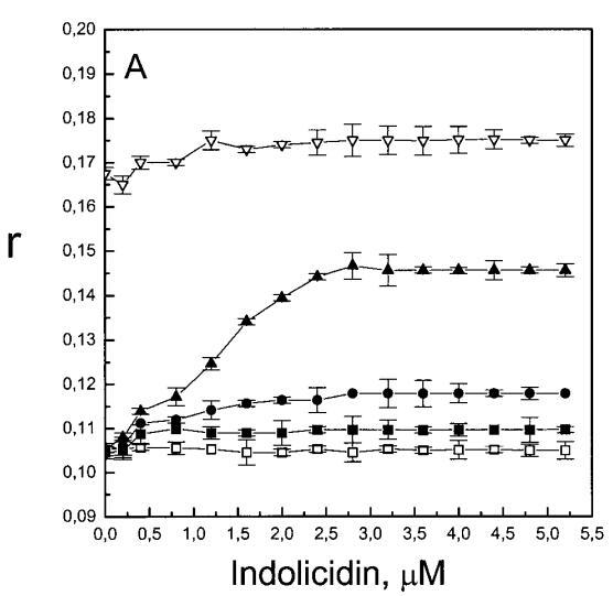 與magainin 2類似,吲哚青霉素與陰離子和兩性離子囊泡的膜結(jié)合非常不同(圖1b、4和5),與先前的平衡透析研究一致(Ladokhin et al.,1997)。雖然芘熒光的猝滅顯示吲哚肽被分配到SOPC雙層中,但對(duì)膜酰基鏈順序幾乎沒(méi)有影響(圖5)。相反,吲哚西啶與陰離子膜的相互作用導(dǎo)致脂酰鏈順序增加,明顯表現(xiàn)為DPH熒光各向異性增加,并對(duì)XPG呈S形依賴(圖5)。與magainin 2相反,吲哚西丁導(dǎo)致芘單體和準(zhǔn)分子發(fā)射強(qiáng)度顯著平行降低,與脂質(zhì)成分無(wú)關(guān),Ie/Im變化較小(圖4)。相應(yīng)地,吲哚西丁誘導(dǎo)酸性PG富集到微區(qū)。有趣的是,在吲哚西丁/脂質(zhì)摩爾比為1:20以下,芘Im的減少順序?yàn)閄PG=0.40.20.10(圖4a),而在吲哚西丁/脂質(zhì)摩爾比為1:10時(shí),Im的減少對(duì)XPG的依賴性相反。這種變化的可能機(jī)制如下。在低肽/脂摩爾比時(shí),吲哚西丁似乎被調(diào)節(jié)到雙層界面(Ladokhin等人,1997),芘標(biāo)記鏈的鏈反轉(zhuǎn)(Holopainen等人,1999)使該部分更接近雙層表面,從而允許其與吲哚西丁的基本殘基接觸。后者通過(guò)π-陽(yáng)離子相互作用導(dǎo)致芘部分的碰撞猝滅。然而,隨著XPG的增加,我們可以預(yù)期PG頭基與吲哚西丁的堿性殘基發(fā)生靜電結(jié)合,從而阻止芘與吲哚西丁的陽(yáng)離子殘基之間的直接接觸。隨著肽濃度的增加,吲哚肽的膜結(jié)合以協(xié)同方式增強(qiáng),猝滅效率的逆轉(zhuǎn)可能涉及雙分子層中脂肽復(fù)合物的聚集。因此,在酸性含磷脂的膜中,吲哚對(duì)芘的猝滅作用較小。當(dāng)吲哚肽的濃度增加到肽/脂比1:10以上時(shí),肽將以高度協(xié)同的方式并入膜的酰基鏈區(qū)域(Ha等人,2000)(圖9 E),而在中性膜中,肽位于界面(圖9 D)。插入吲哚西丁的量取決于雙層中的XPG,導(dǎo)致吲哚西丁的Trp殘基的猝滅占主導(dǎo)地位,與XPG=0.4時(shí)Im的顯著減少一致(圖4a)。