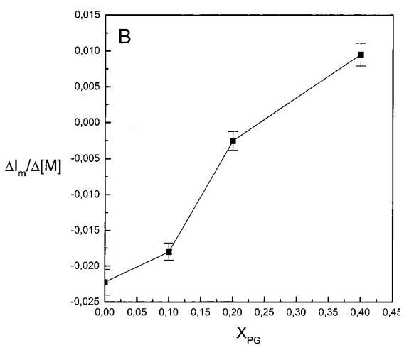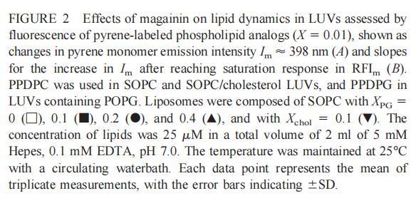 繼上述單層研究之后,有興趣探索肽對(duì)脂質(zhì)動(dòng)力學(xué)的影響。這是通過(guò)使用熒光光譜和不同脂質(zhì)成分的LUV完成的,記錄芘標(biāo)記的熒光磷脂類似物PPDPC或PPDPG的發(fā)射光譜(均為X=0.01)。對(duì)于SOPC LUV,添加magainin 2導(dǎo)致芘熒光顯著猝滅,芘單體和準(zhǔn)分子發(fā)射強(qiáng)度平行降低,如Im所示(圖2)。作為XPG的一項(xiàng)功能,還研究了馬蓋寧2與脂質(zhì)體結(jié)合的后果。當(dāng)XPG從0.1增加到0.4時(shí),觀察到由于magainin 2在398 nm處逐漸增強(qiáng)的Im(RFIm),而Im的初始增量在明確定義的PG/magainin 2化學(xué)計(jì)量比~2、3和5時(shí)趨于平穩(wěn)(圖2 A)。在這個(gè)初始階段之后,直到給定的化學(xué)計(jì)量比,還有第二個(gè)過(guò)程,其斜率也隨著XPG的增加而增加(圖2b)。在XPG=0和0.1時(shí),Magainin 2僅引起Ie/Im的輕微變化,而在XPG=0.2和0.4時(shí),分別減少10%和25%是明顯的(圖3 A)。為了區(qū)分脂質(zhì)動(dòng)力學(xué)中兩種性質(zhì)不同的變化,即側(cè)向遷移率和微結(jié)構(gòu)域形成,作為上述Ie/Im變化的根本原因,我們還通過(guò)測(cè)量DPH的熒光各向異性r來(lái)評(píng)估酰基鏈順序的變化(圖3 B)。在缺乏酸性磷脂的情況下,Magainin 2幾乎不會(huì)引起r的變化(圖3B)。然而,隨著XPG的增加,加入magainin 2后脂質(zhì)堆積和酰基鏈順序逐漸增加(圖3b),XPG=0.4時(shí),r最大增加1.4倍。值得注意的是,XPG=0.1時(shí)Ie/Im沒(méi)有變化以及酰基鏈順序的增加表明PPDPG正在發(fā)生微觀富集。有趣的是,在存在膽固醇(Xchol=0.1)的情況下,由于馬蓋寧2的作用,Im和Ie都顯著降低,Ie/Im的變化不顯著(圖2A和3A)。如前所述(van Ginkel et al.,1989),添加肽前r的增加(圖3 B)揭示了通過(guò)在膜中摻入膽固醇而增強(qiáng)的膜順序。然而,在膽固醇存在的情況下,magainin 2對(duì)r沒(méi)有進(jìn)一步的影響(Xchol=0.1,圖3b)。