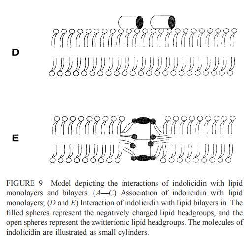 吲哚西丁只含有13個(gè)氨基酸,因此太短,無(wú)法跨越雙層。然而,該肽可以作為聚集物或帶有相關(guān)酸性磷脂的頭尾二聚體橫跨雙層(圖9 E),從而導(dǎo)致膜不穩(wěn)定性。已經(jīng)證明,吲哚西丁能夠通過(guò)穿過(guò)外膜殺死革蘭氏陰性細(xì)菌,并通過(guò)形成通道破壞細(xì)胞質(zhì)膜(Falla et al.,1996)。與magainin 2的作用相比,吲哚青霉素誘導(dǎo)的內(nèi)吞小泡較小(圖7)可能反映了這些肽與脂質(zhì)相互作用的不同模式。一些吲哚肽分子可能會(huì)轉(zhuǎn)移到膜的內(nèi)部小葉中。除了具有廣譜的抗真菌和抗菌活性外,吲哚西丁對(duì)哺乳動(dòng)物細(xì)胞也有毒性(Schluesener等人,1993年;Ahmad等人,1995年)。有趣的是,吲哚西丁對(duì)SOPC和SOPC膽固醇巨型脂質(zhì)體的作用不同。在這一階段,根本原因尚不確定,可能與膽固醇對(duì)雙層結(jié)構(gòu)以及吲哚肽在膜中的取向的影響有關(guān)。因此,需要進(jìn)一步的研究來(lái)闡明膽固醇對(duì)吲哚肽膜結(jié)合的影響。
